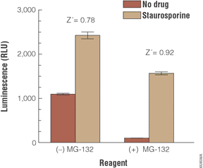 Comparison of the Caspase-Glo 8 Assay with and without the proteasome inhibitor, MG-132. Note the improved signal:noise ratio when MG-132 is included as well as the improved Z'-factor, an indication of assay performance widely used in screening applications. Data was generated in 384-well plates.